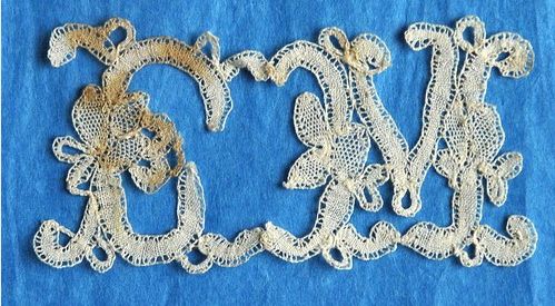 Comments: I’ve seen Honiton initials like this made by Mrs. Sharp (Author of Point and Pillow Lace), who operated in the early 20th century. No actual provenance is assigned to this piece, but they are nicely done and since they are joined, probably made for a specific customer. A little discolored, but basically good condition.