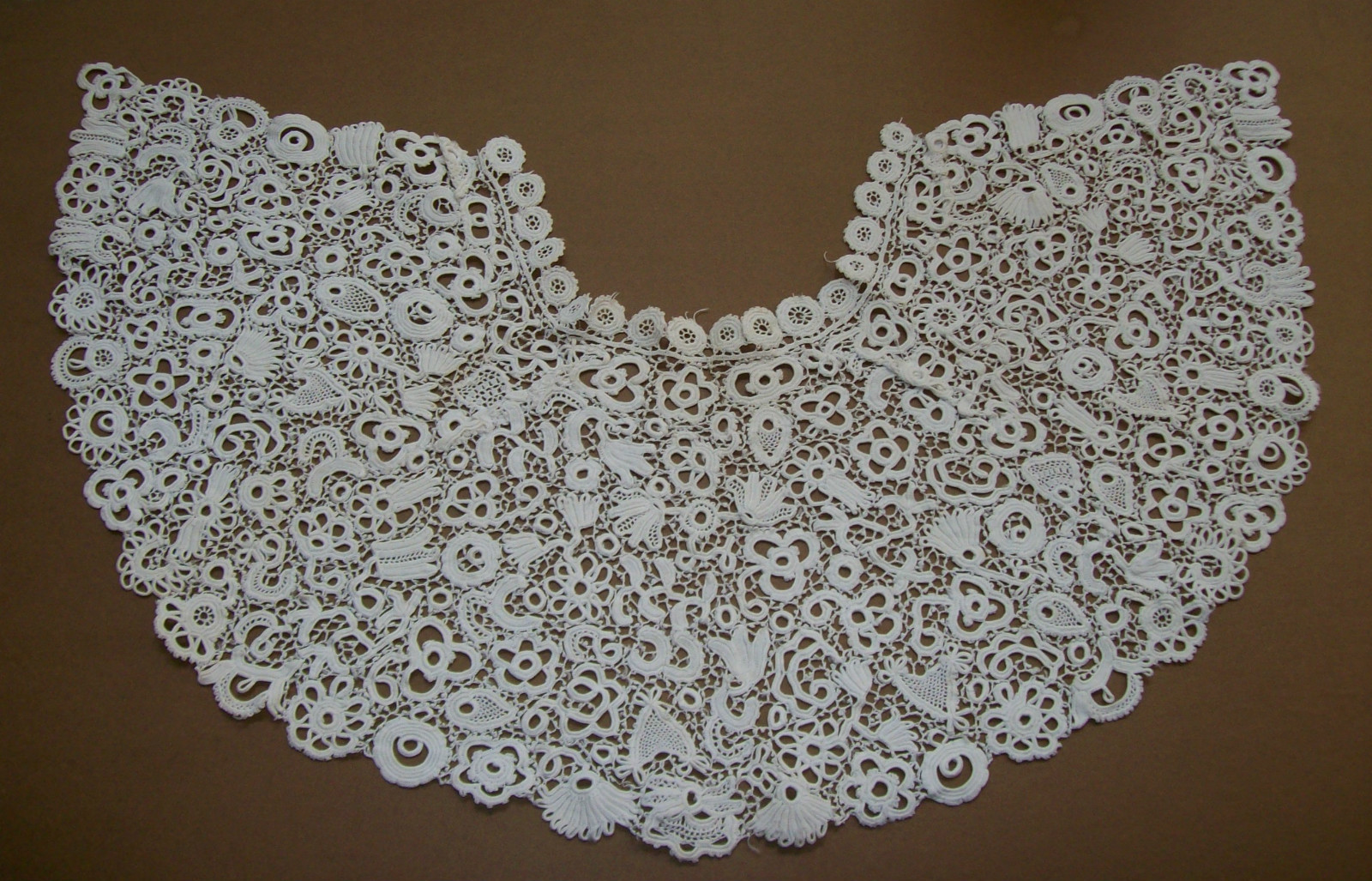 Comments: A Brussels Duchesse neckpiece in very good condition. The Point de Gaze insert has a rose, but it’s hard to tell if the petals are raised. A fairly conventional design, but it gets lots of points for condition.