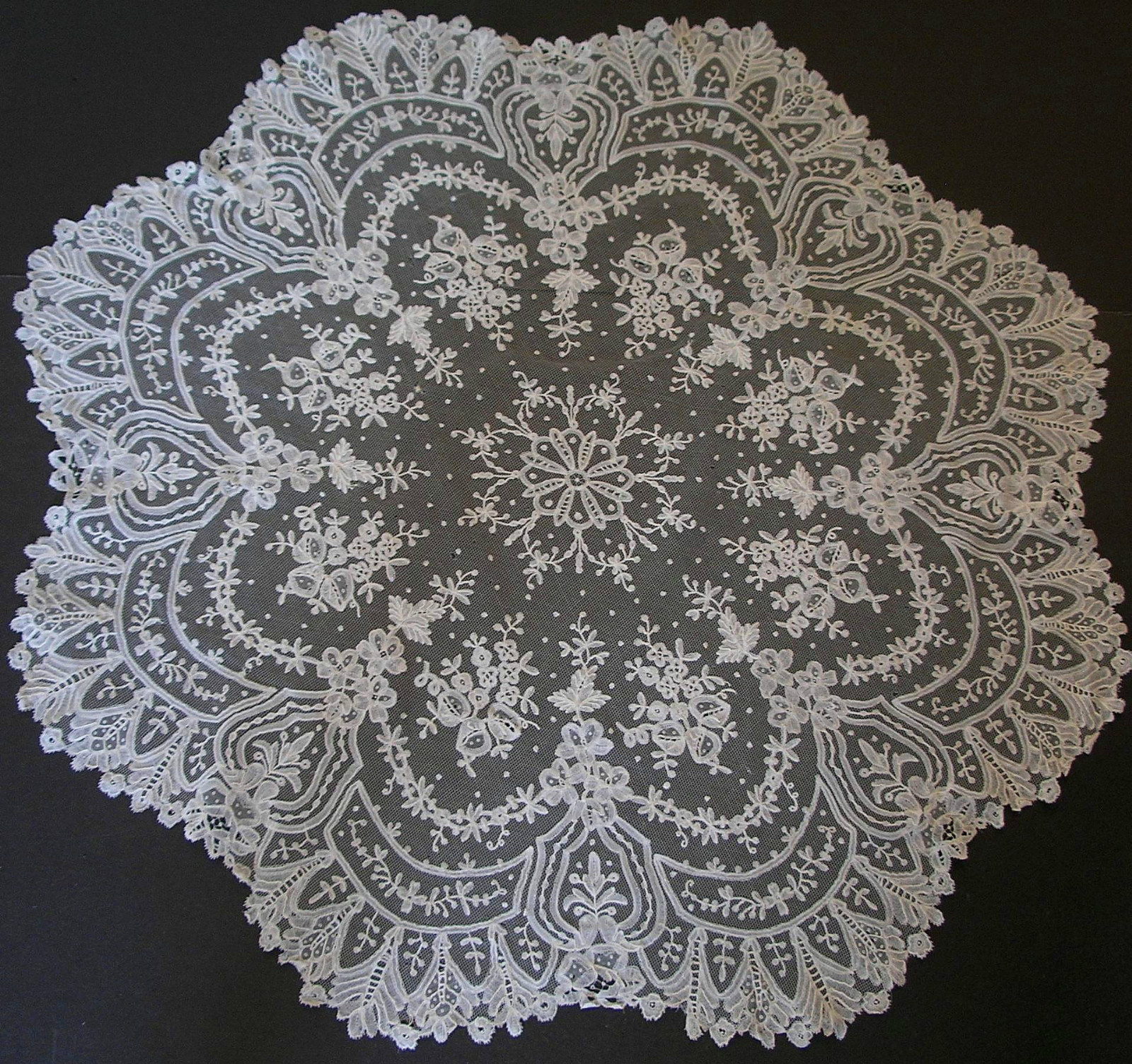 Comments: A scalloped ’round’ piece of Brussels bobbinlace application on machine net. Note the 8-fold symmetry which might speak to a small parasol cover, however there is no hole in the center. I’m thinking it started out that way, but was never properly mounted. This kind of lace was really never done up in large ‘doilies’. There are a few needlelace elements, basically some Point de Gaze mesh used as fillings, and rings worked on that mesh. And one picoted ring at the center point. A few small holes in the net, not particularly serious. Overall condition very good.