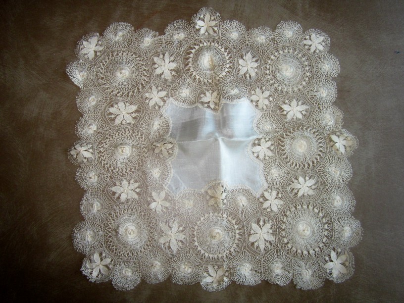 Comments: A Teneriffe handkerchief, origin unknown. It does seem to have a silk center. Likely Ñanduti, although as in the piece reviewed above, there aren’t any palm leaves or lattice needleweaving. Looks in very good condition from the photos.