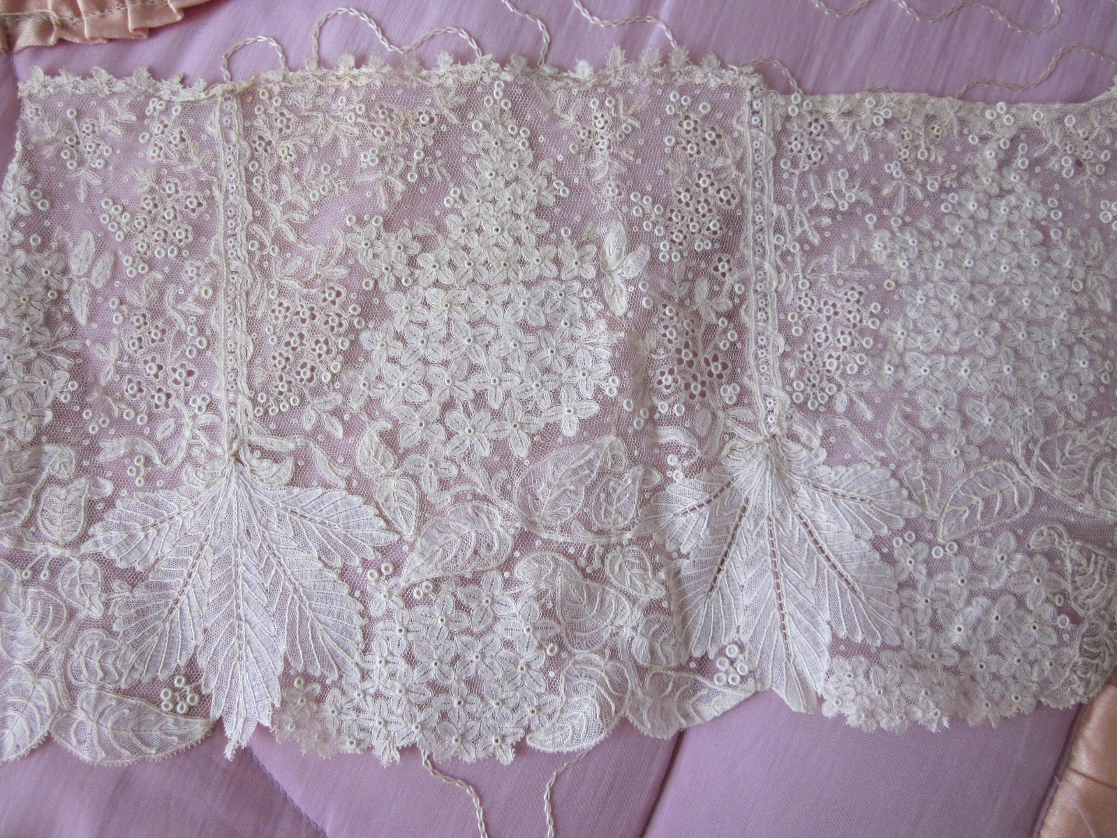 Comments: I find this set quite interesting, even beyond the fact that it has survived intact. The naturalistic oak leaves, and perhaps acorns? is an unusual motif even for a Brussels lace. I’ve seen a few collars like this before with very naturalistic leaves, and they all are a puzzle. I wonder if it’s maybe a Ghent piece, note the ‘line-drawing effect in the acorns which is almost taken from Valenciennes. Overall condition very good, just a few loos threads along the border of the cuffs, probably clipped off from a sewing thread. Maybe a little problem along the inner edge of the collar just to center right? Nothing major.
