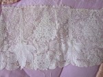 Comments: A Honiton fallcap. The design is roughly symmetric around the center line, definite snails/slugs era. A fairly haphazard pattern. The ground is needlemade, making this a ‘Point Honiton’ piece, although not quite as systematically done as in other pieces. Large areas of tally fillings. A little frayed and some breaks especially along the outer edge. I think there has been some repair. Seller says the piece has been cleaned but gives no details on how this was done.