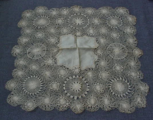Comments: A Teneriffe-type handkerchief. Given the origin of the seller, it could be Ñanduti although it doesn’t have the typical palm leaf motifs or lattice fillings. Good design in the roundels, and execution is done with a reasonably fine thread. Overall good condition, seller cites some yellow stains, but the lace seems intact.