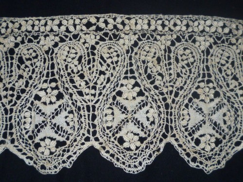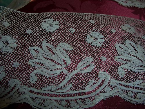 Comments: A very long, wide Valenciennes border, probably Belgian. The design isn’t quite as sophisticated as one might expect in a piece this size, but still nicely made. There are only a photos of selected spots, and it’s hard to tell condition for a piece this long., although what is shown looks very good. The seller doesn’t give details that I can understand. In particular, I wonder if there are any joins.
