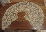 Comments: A Maltese mantilla headcover with lappet ends, which is nicely design but seams a bit the worse for wear. It could probably be blocked back into reasonable shape. Good guipure, lots of well done tally grounds. The lace itself doesn’t seem damaged, it’s mainly the edges that bother me.