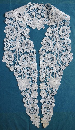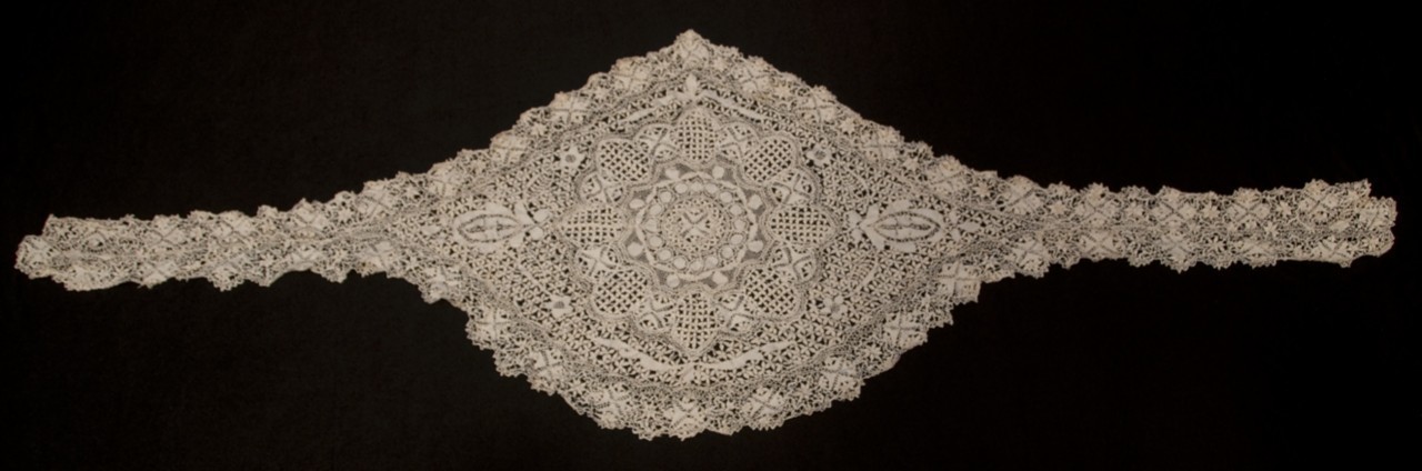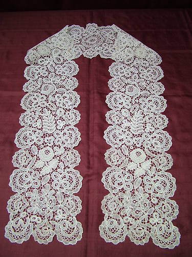 Comments: Quite an interesting Duchesse lappet scarf, note the rather extensive bride confusion in the center. The lace itself is well worked, note the raised elements on halfstitch ground throughout. Naturalistic design, a little better than one usually sees.