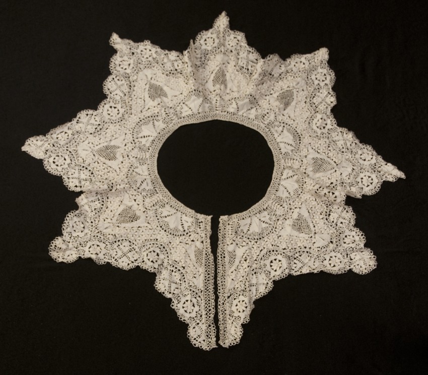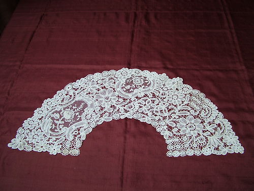 Comments: A Bruges collar with a few needlelace fillings derived from Point de Gaze. Seller cites occasional broken bride, but I can’s spot anything from the photos. Overall very good condition.