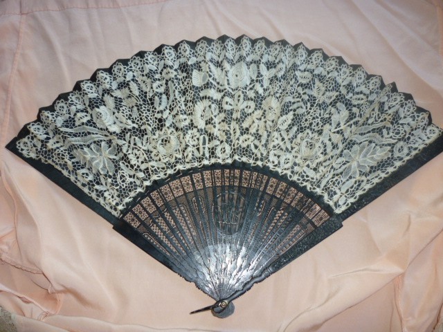 Comments: You see mother of pearl sticks like this a lot on fans, but seldom with a lace of t his quality. It is the highest quality of Belgian ‘Point de Gaze’ type, almost over into the more Zele fine Venise types. The clothwork is almost a little too solid for standard Point de Gaze. Very naturalistic flowers, no raised petals, some raised rings for relief, and interesting mode fillings. I see a few pinholes in the mesh of the lace, seller cites a few spots and one brake in a slip of one of the ribs (trying to use proper fan terminology here, see http://tinyurl.com/7ergzp3).
