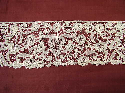 Comments: A Bruges border with a bold design of just two motifs – a leaf and a three-headed flower. Nicely worked. Seller cites minor pulls, overall very good condition.