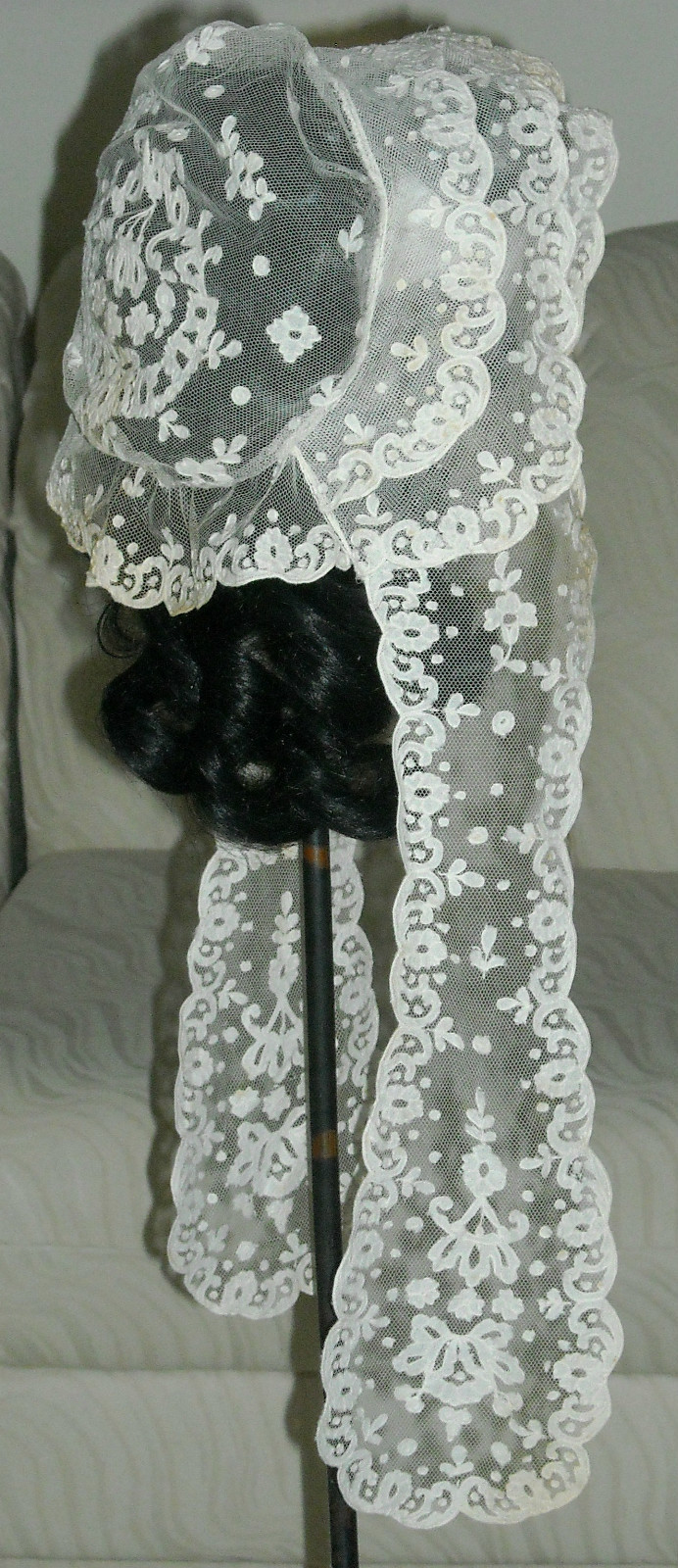 Comments: A bonnet with lappets of muslin applique on machine net. An impressive looking assembled piece. Very good condition, seller notes a few pinholes in the net and faint stains, minor.