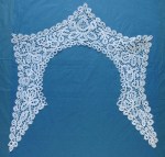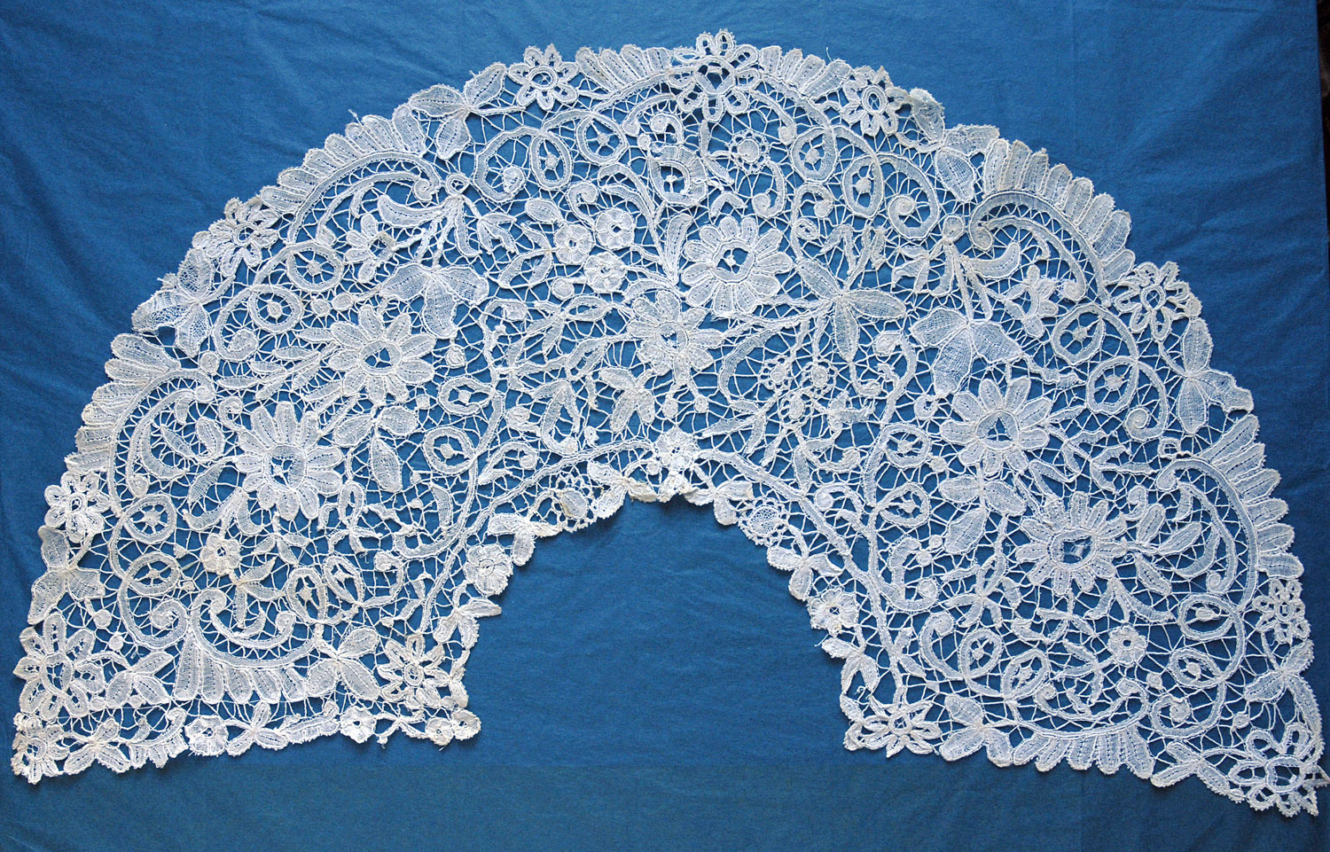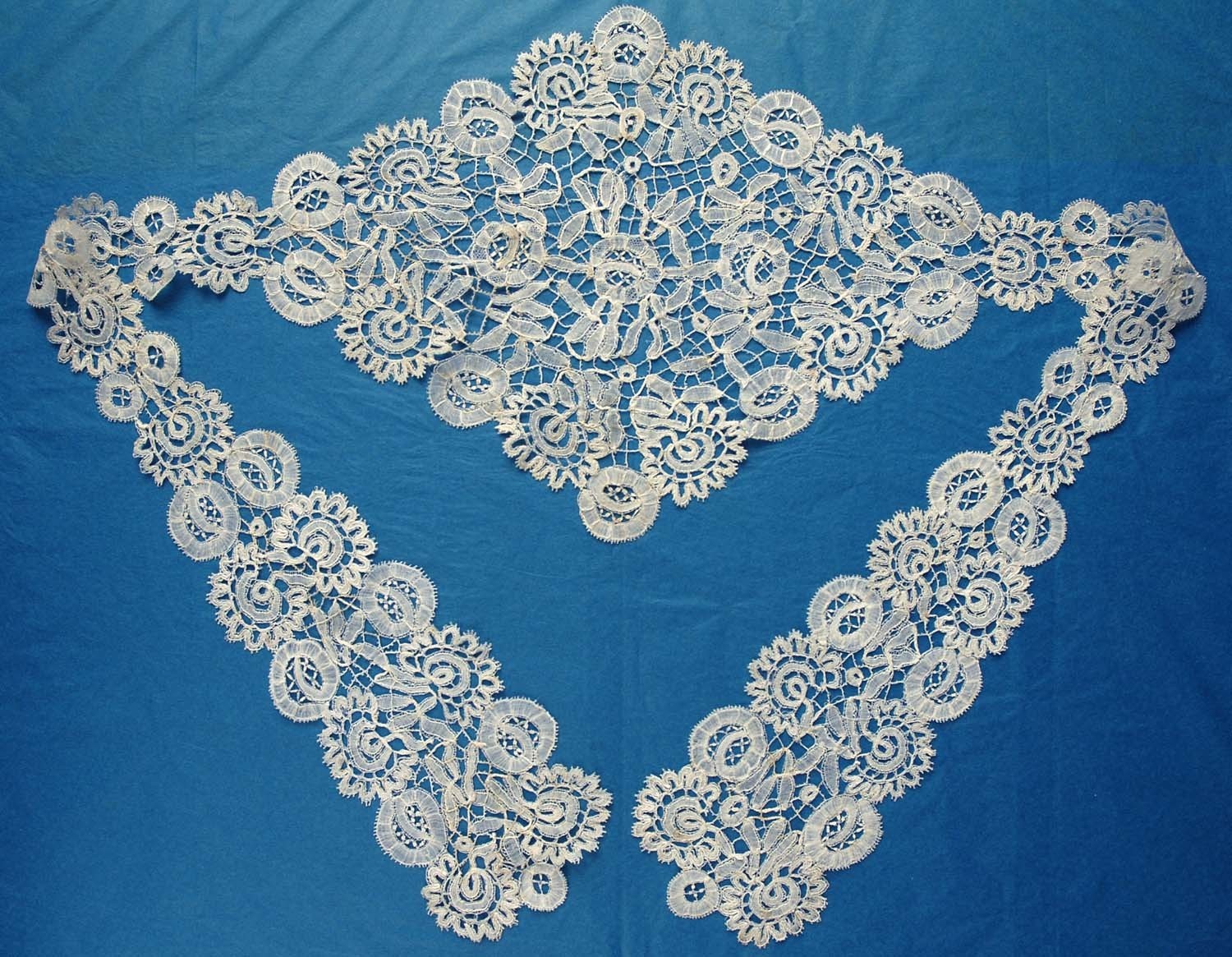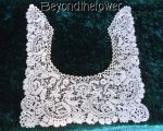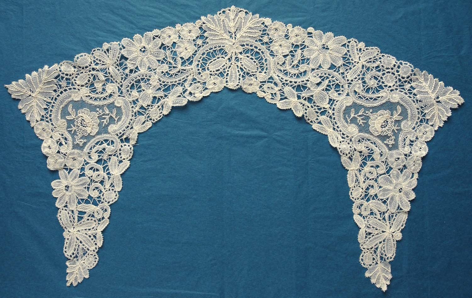 Comments: A Bruges Bloemwerk bobbinlace lappet collar. I like the regular edge and athe nice placement of the end flowers. Condition looks very good. Note the large flower at the back point of the piece. An unusual form, nicely done.
