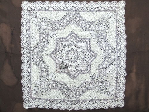 Comments: A square Maltese cover for something – I don’t think it’s a table cover since it doesn’t have a cloth center. It’s a little small to be a shawl. But it has a great 8-pointed star design, good guipure in the corners, and a very dense leave ground. An impressive looking piece. Not many photos, but the condition looks very good.
