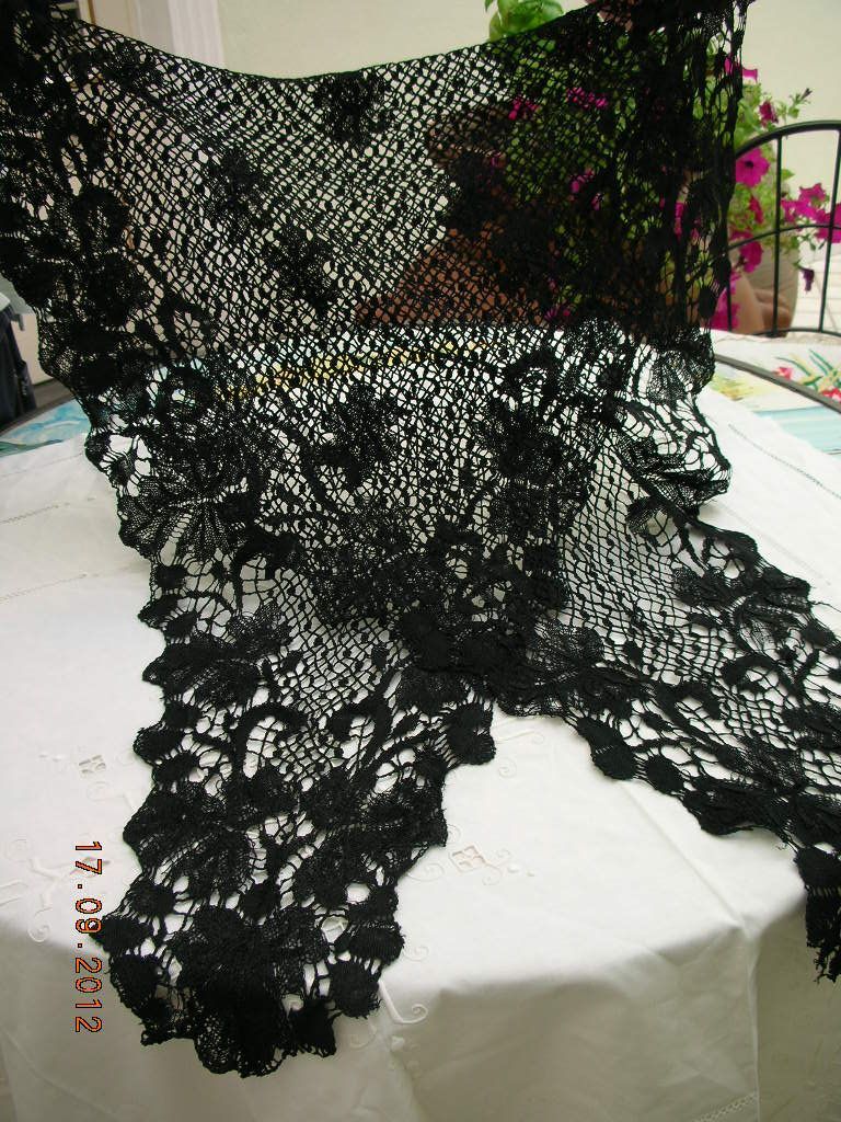 Comments: The post says this is a headcovering that women wore to church. I’m not sure where it’s from – it has an interesting ground typical of Le Puy, but the relief work is unusual. The half stitch is also done quite loosely. I think it’s pretty big if you scale it in relation to the table it is spread on. Looks like black silk, it’s an interesting piece, and seems in generally good condition. But it’s hard to tell – I do see some loose brides and what looks like wear to the motifs.