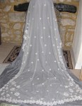 Comments: A veil of Honiton appliqued on machine net. Note with the piece states it was cleaned, but not repaired din 2009. Note the good quality of the net, a little sturdier than what you often find in Brussels application, and with a beautiful drape. There is a large shell-like flower/leaf decoration running on what looks like all 4 sides, with some motifs in the corners, and scattered sprigs in the ground. Snails/slugs era, nicely done. A few pinholes in the net, overall very good condition. I believe the accompanying note states that it was evaluated by Pat Perryman at the Honiton museum.