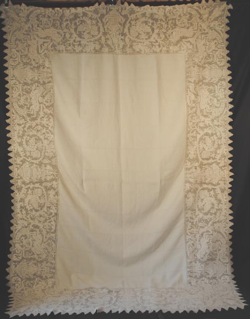 http://tinyurl.com/9xnplg7 19 C. HANDMADE ITALIAN FIGURAL BURATO NEEDLELACE LINEN TABLECLOTH 101″ x 65″