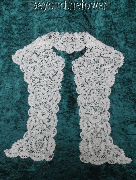 Comments: This is certainly the week for Honiton. This dress front (the bib part goes in front) has a very dense, asymmetric pattern, still rather snails/slugs. Note the extensive tally fillings in the scrolls, unusual. I like the smaller flowers used around the edges. Condition appears very good from the photos. Even more Honiton if you look at the sellers additional items.