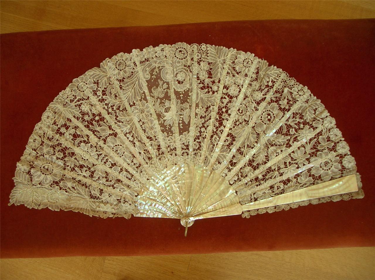 http://tinyurl.com/9glngzu LG HANDMADE Antique Vtg BRUSSELS POINT DE GAZE LACE MOTHER OF PEARL HAND FAN