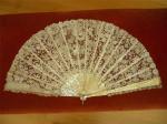 Comments: The Point de Gaze in this Brussels Duchesse fan is really nice. Note the pointed raised rose petals with little diamond windows – sign of a better manufacturer. And athe bobbinlace is above average in design. It’s a big piece, and the MOP isn’t showing so much as to detract from the lace. Condition appears very good from the photos. Some damage and repairs to the sticks, lace has expected age discoloration.