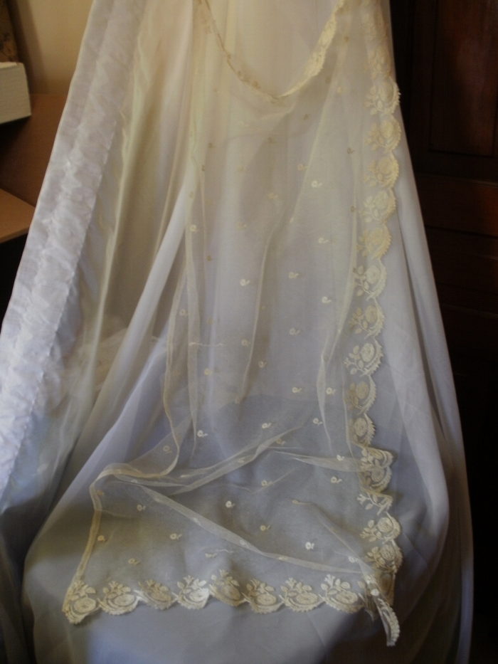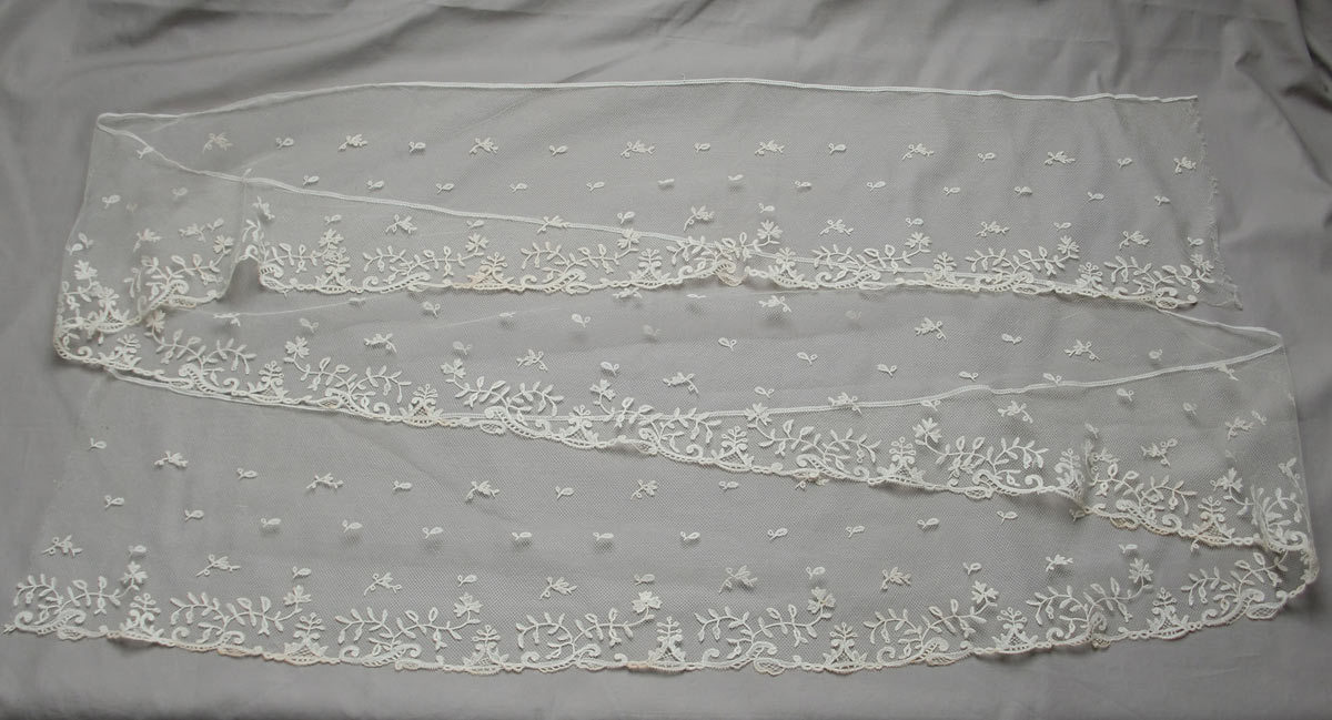 Comments: A bonnet veil of Brussels bobbinlace application on machine net. A border of single roses and leaves with a small scallop on three sides, sprigs regularly scattered in the ground. The 4th side appears plain as you would expect from a bonnet veil, however there’s not enough information to determine if it was just cut down from a square veil. I don’t think so, feels original. Seller cites some repairs and pinhole to the net, but it seems in overall good condition.