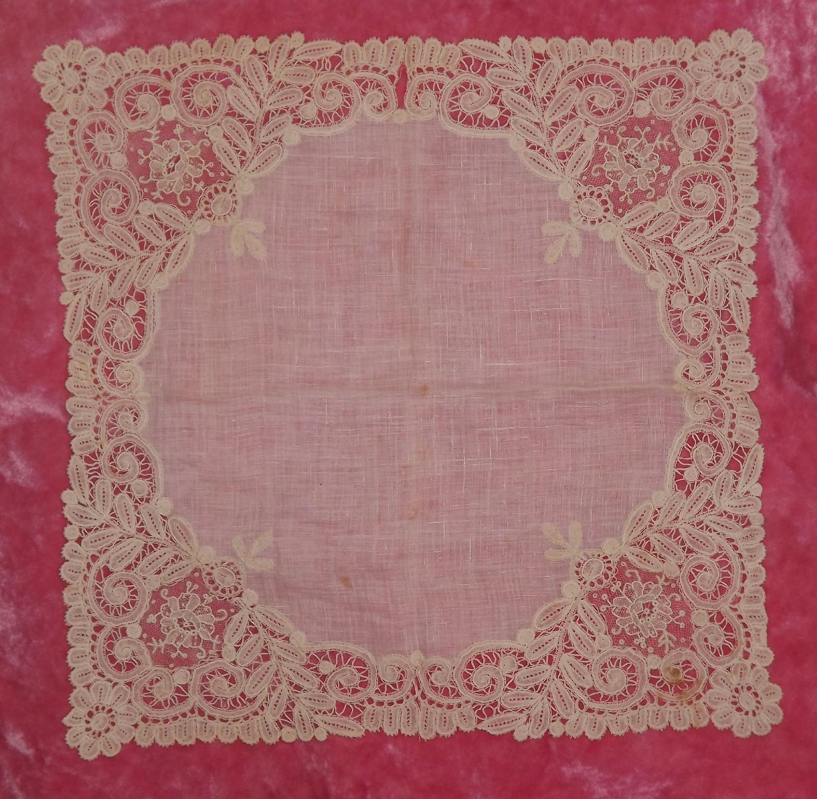 Comments: This Brussels Duchesse handkerchief is in good condition, one hole which could be mended, and a little staining. It’s a nice simple design, and the point de gaze inserts have no raised work. A good middle market product.