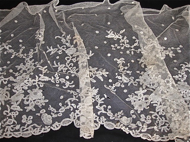 Comments: This is the week for applique! Honiton appliqued on machine net, a wide flounce. Nicely worked motifs, good tally fillings, and a fairly dense design over the tulle, with small dots at the upper part and between motifs. Lots of tally fillings in different patterns over large areas. Wish it had been laid out flat for photos, hard to get a good look at the design and see how it repeats. You can see some obvious holes in the net, other areas look good. Seller says some motifs are coming loose, not unusual for a piece like this.