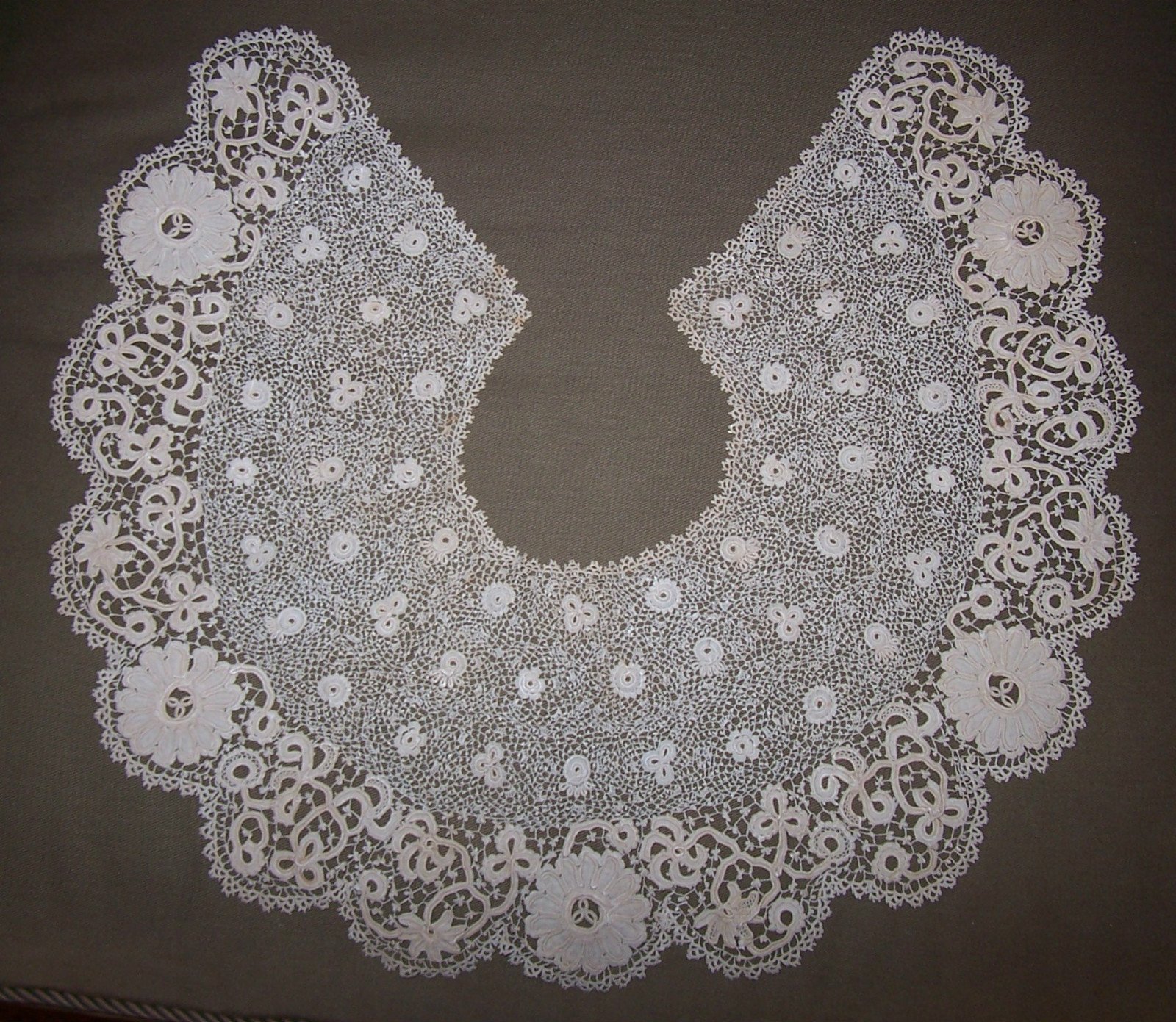 Comments: An interesting Irish Crochet collar with very heavy border motifs, and a lighter Rose of Sharon inner design. Trefoil picots on the brides for the large motifs, but I don’t think they are Clones knots. It looks as though it was made all in one piece, not reassembled from two designs. A good bold pattern, quite effective, and in very good condition.