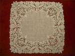 Comments: A well-done figural bobbinlace, the challenge is to figure out from where. Most of this type of lace comes from Italy, the Genoa area. But the lace border seems more Bruges to me. Opinions are always welcome. Beautiful detail work on the central figure. There is a little staining, but the lace itself is nicely intact. Very good condition in general.