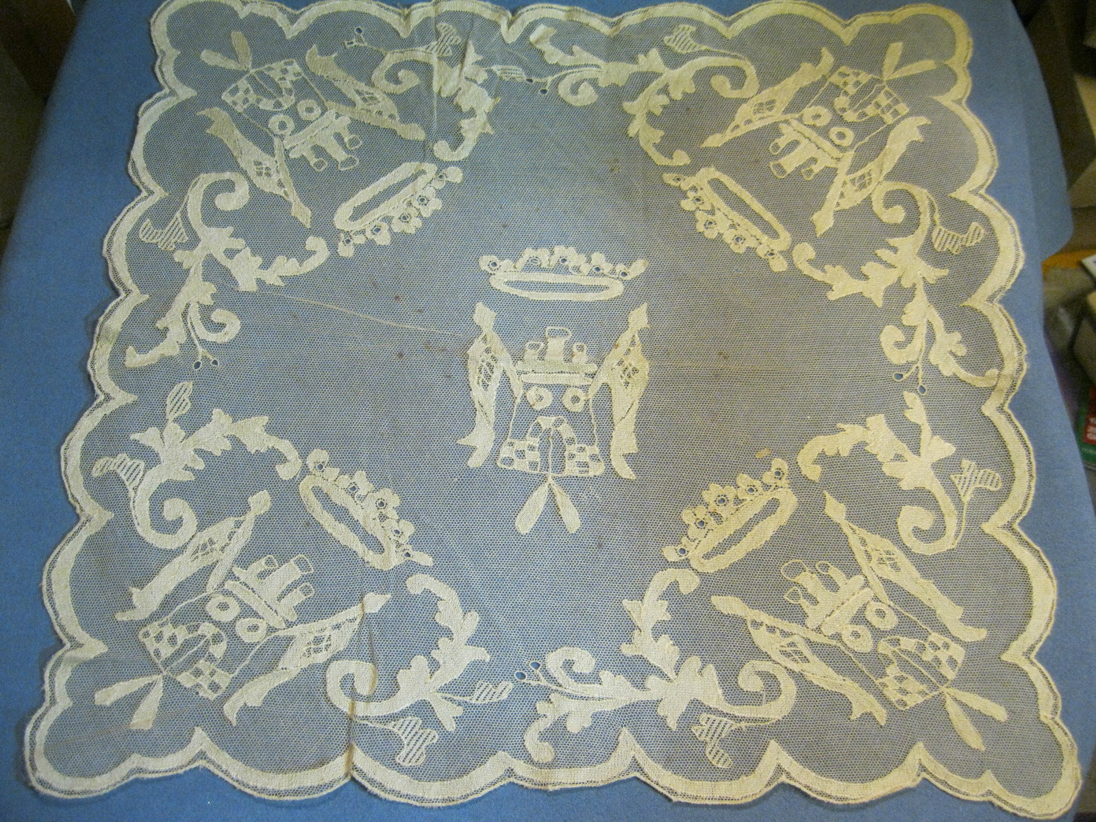Comments: An embroidered net square – the size of a hanky, but I doubt it was intended as such. The design is quite interesting, and feels like it might be a war lace. I’ve tried to identify the coat of arms with no luck – can anyone help here? The embroidery is dense and well done, edges nicely finished. I don’t see any obvious holes in the net although there are some dark spots that are obviously weak. Basically good condition.