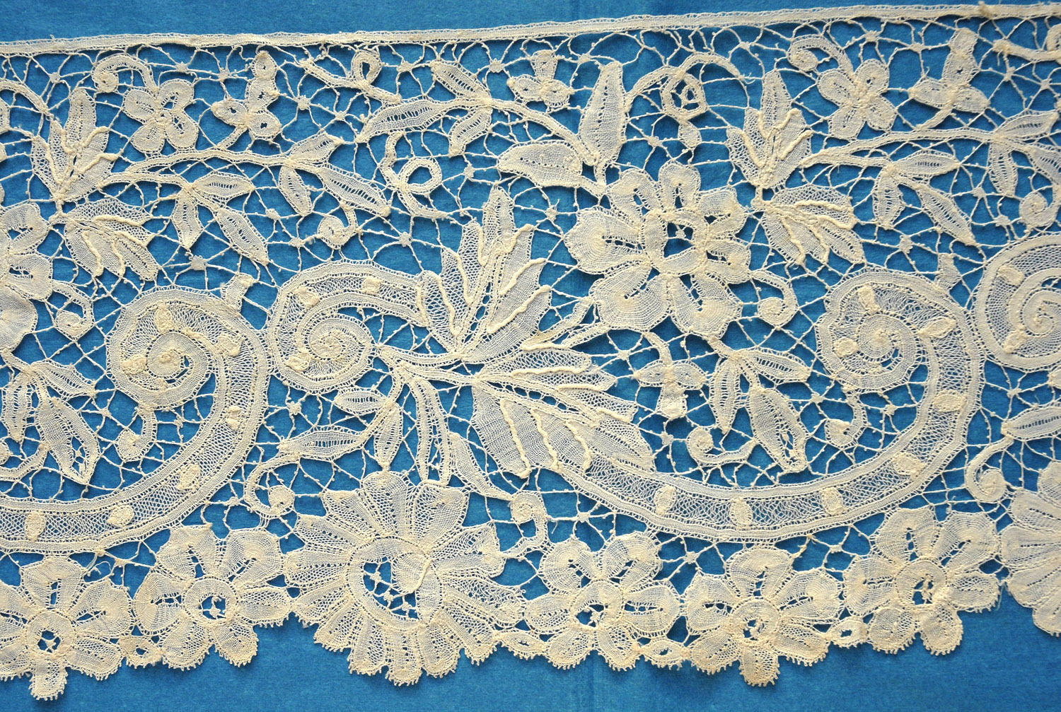 Comments: Quite a long length of Honiton guipure. It is in the snails/slugs tradition, but densely work with large areas of tally fillings. Lots of extra points for condition on this one.