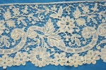 Comments: A veil of Brussels needlelace application on machine net. I think it’s a bit large for a hat veil, and there is a deep border on one side, the other three are finished with smaller motifs. Most hat veils would have one edge plain that could be gathered. The needlelace is quite flat and light; a very good compliment to contemporary fine bobbinlace applications. Note, no esprits in the main part of the net. The motifs don’t seem all that crisp – might be a sign of a past washing. A few pinholes in the net, and some loose areas around a few motifs. Overall good condition. This is an unusual piece, needlelace appliques of this quality don’t come up that often.