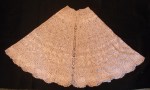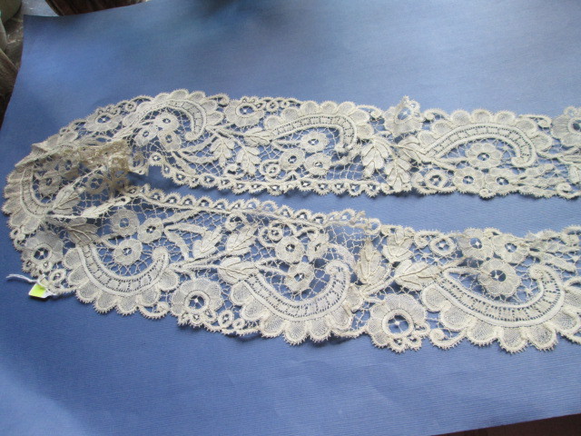 Comments: A semi-circular Maltese cape, which is a bit unusual form. Typical construction of several different lengths sewn together – wish it had been opened up for the photograph so the pattern would be more evident. Lots of good guipure, a dense woven leaf ground, and note the typical undulating border on the outside. Condition appears very good, seller notes only minor defects. Nice looking piece, and whiter than it appears from some of the photos.