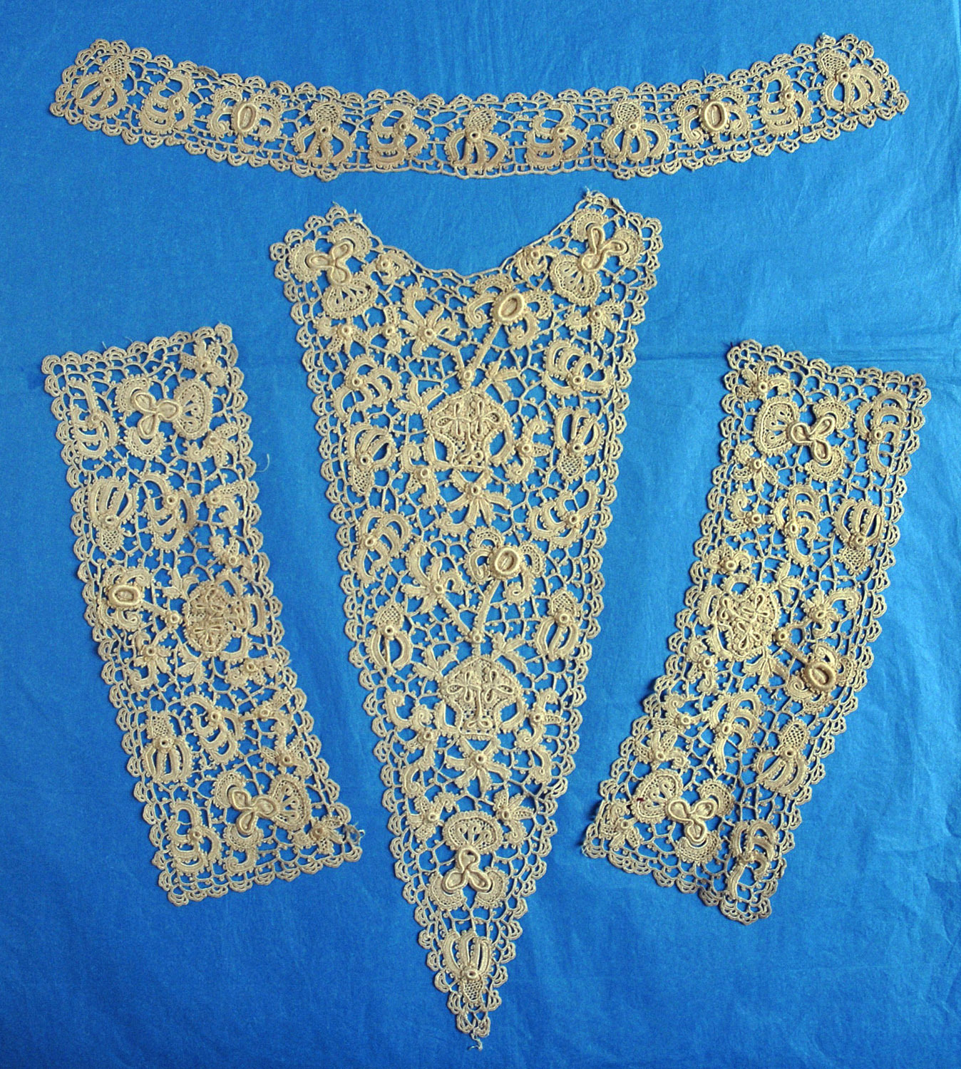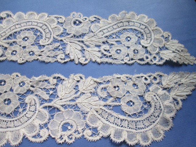 Comments: Silk Irish Crochet is relatively rare, and this is as complete a parure as you might want to find. The small, beautifully done motifs with raised work reflect the Italian Gros Point and Rosepoint origins of the lace. Note the little looped picots used on the brides and as edges to the motifs. Overall condition looks very good – I might spot a small stain here and there, but nothing important.