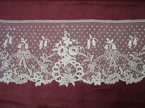 Comments: A Brussels application on machine net using both bobbin and needle motifs. Quite a complex piece for such a narrow width. And note the extensive needlelace rings used as esprits in the ground. A naturalistic design of bows and flowers, although the needlelace looks much more delicate than the bobbinlace. From a distance is works very well, closeup the contrast is a bit much for me. Seller cites a few minor pulls in the tulle, and I do spot a few holes in the net too. Overall good condition looks good.