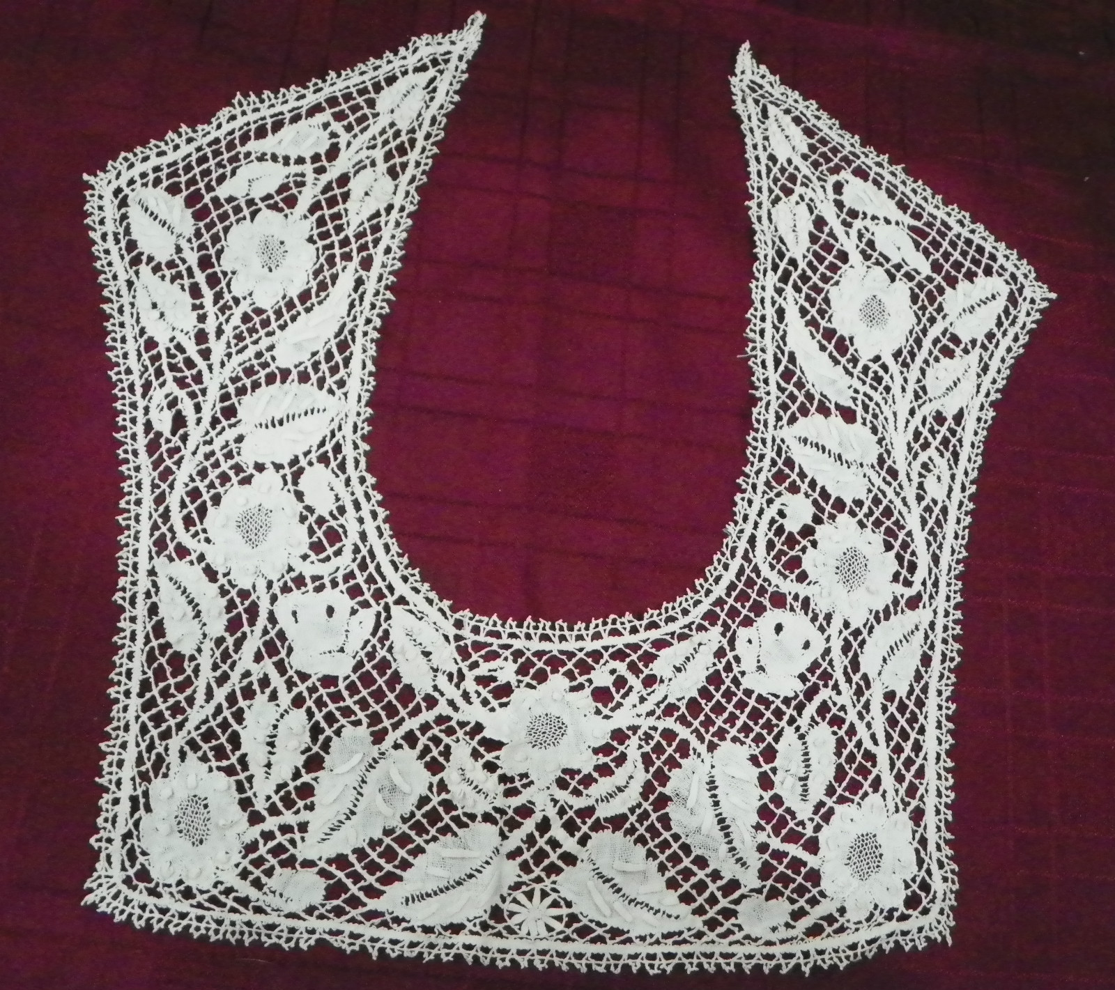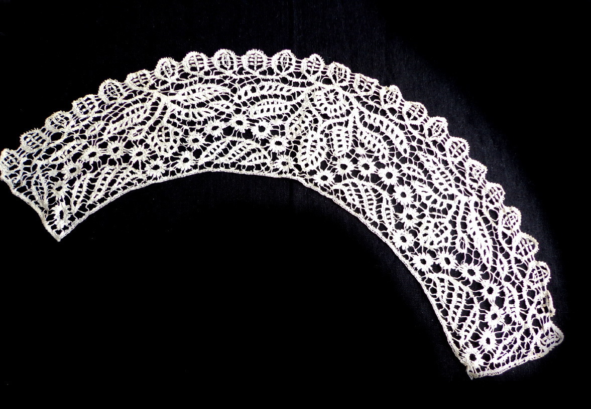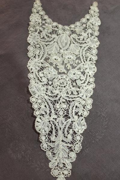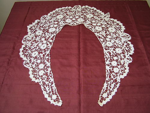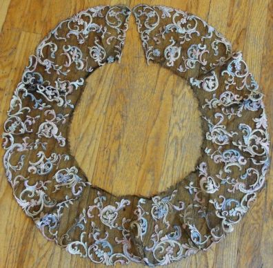 Comments: A small Point de Gaze collar, with some raised petal roses. Note the little ports in the raised petals, and also the linked picots around the outer edges. I think they are trying to copy Alençon with this technique. It’s a well made piece, but the design is a bit conventional, despite the more advanced technical indicators. Very good condition, seller cites one minor hole and a little spotting.