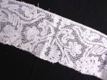 Comments: A Honiton Guipure border. At 3.25″ wide, the motifs are smaller than you might think. Snails/slugs, a bit loosely worked, and the design is a bit confused. Note the long reach of the bobbin-made brides tending toward a hexagonal mesh. A little frayed, not bad, and basically good condition.