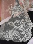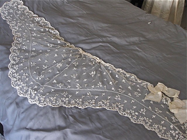 Comments: Looks like a mantilla – the lace is tambour embroidery on machine tulle. A little discoloration, few pinholes in the tulle, basically good condition.