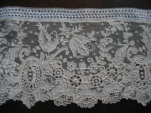 Comments: A flat Point de Gaze border in a good collectible length. These laces can be some of the finest Belgian products, and this one is definitely a higher-end market piece. Nice work in the decorative fillings, especially in the oval cartouches. The design is quite naturalistic. Condition appears very good, although I think I see a little staining at the top in one place. Minor.