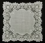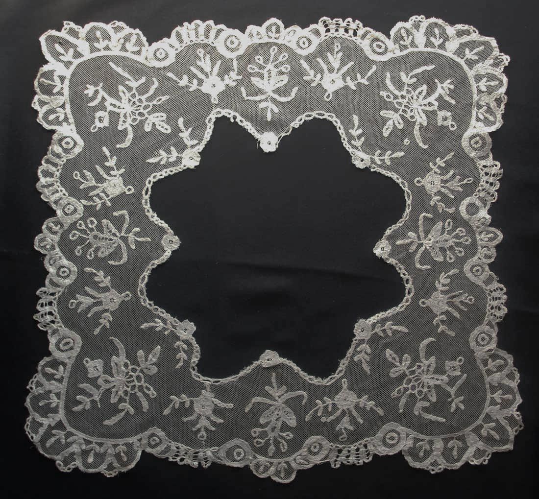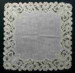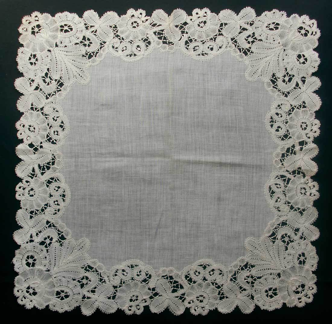 Comments: A handkerchief edging of Brussels bobbinlace application on machine net, no cloth center. I don’t see any needle lace. A middle market piece, the net looks in good condition – 2 pinholes. Seller also cites a few pale orange marks.