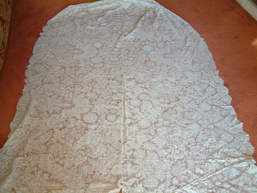 Comments: 11/6/12 – this piece was posted very recently with a short auction time, so I’m adding it to the end of the 11/3/12 Alerts. Two wide flounces joined together to form some kind of cape, probably Brussels manufacture. There is a ground, but the photos aren’t close enough to tell exactly how it is made. It’s also a bit hard to tell how this was put together, and it’s hard to tell if the food edge is completely intact. I think there might be some raised edges in the motifs, but overall the work looks quite flat. It seems to be much better design than a typical Brabant, so I hesitate to put it in that class. There are a few small holes visible in the photos, but overall good condition. I think it could be disassembled and the individual flounces recovered. An impressive piece.