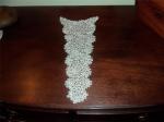 Comments: An unusual dress insert of Irish Crochet. This is a rather early pattern, although I don’t think the lace itself is early. I find the design quite effective; kind of like a Venetian coraline. I see one hole, not too bad, and a little wrinkled. Basically good condition. Actually I wonder if it isn’t some kind of jabot, given the scalloped edges – dress inserts usually have straight sides.