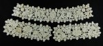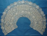 Comments: I’m thinking this is a Burano set from the appearances of the clothwork stitches. There may also have been some kind of frontpiece or dress insert to attach to the longer choker collar. The raised edges on the motifs are quite elaborate and nicely done. These later 19th c copies of Gros Point were done in several places, including England, Austria, Belgium and Italy. Not always easy to tell them apart. This set is in very good condition but with some brown staining which should come out with an appropriately conservative wash.