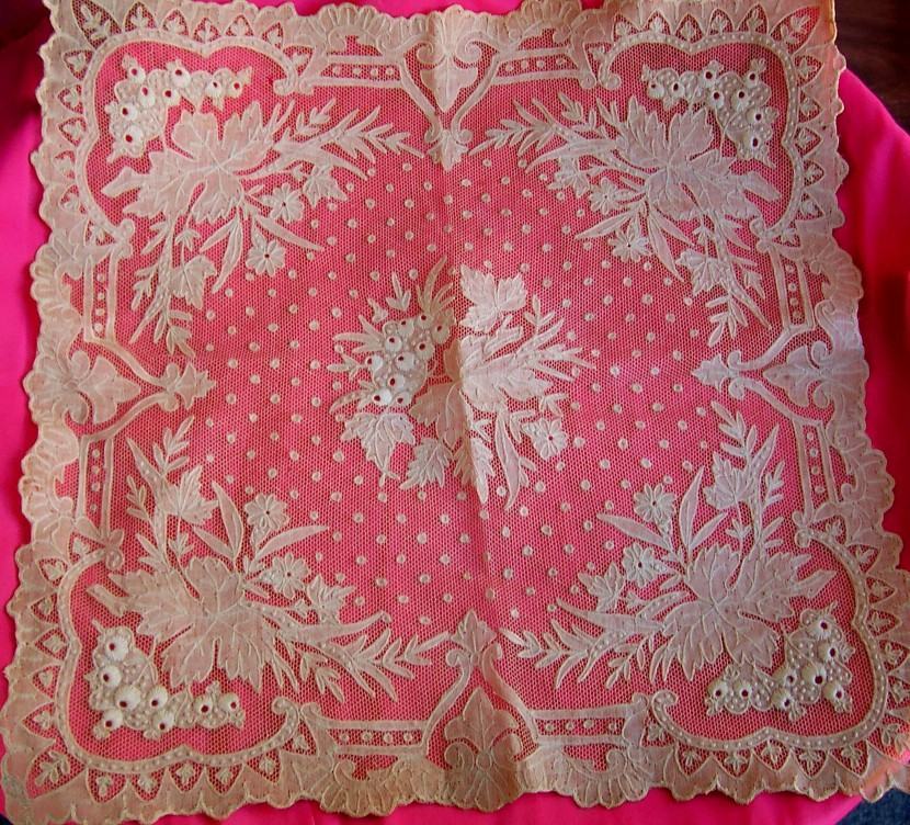 Comments: I don’t think this was intended as a handkerchief – it’s too nice in the center. It is a muslin applique on machine net, quite elaborate with some relief embroidery. The motifs are fastened with chain stitch which might indicate Belgium, but it’s more delicately done than the larger veils one usually sees. Also note the nice circular esprits in the ground. An interesting piece in very good condition, although from the photos I’m not entirely sure what the color is.