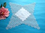 Comments: An interesting tatted handkerchief with especially nice joining to the center linen. Also a good whitework embroidered monogram. The lace is a basic roundel pattern arranged in triangular points around the center square. Unusual, and maybe not too practical for a handkerchief. It looks in very good condition, I don’t see any problems from the photos.