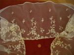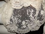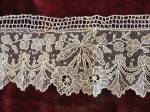 Comments: I’ve seen some really nice pieces from this seller, and this is no exception. A good Brussels Duchesse flounce, just wish there were more of it. Raised petal roses in the Point de Gaze inserts. The bobbinlace is fairly flat, but with a nice curving design. Seller cites a few pinholes in the Point de Gaze, and a little yellowing of the lace. Basically very good condition.