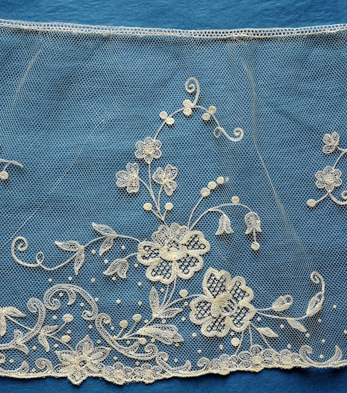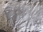Comments: A light border of Brussels bobbinlace application on machine net. The design is fairly sparse, no fancy fillings, and flat bobbinlace with a simple gimp. A middle market product, quite nice looking. And in very good condition, seller cites some tiny breaks in the ground and fraying at the ends, minor defects.