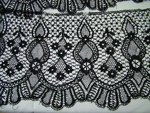 Comments: Three lengths of the same black silk Le Puy pattern. The longest has 4 joins Nice complex ground, and typical Le Puy elements of point and ‘Kat’ stitch grounds, lots of woven leaves. A very architectural, symmetric design, not too complex. Seller cites a few pulls, overall good condition.