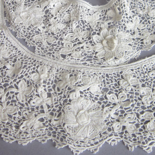 Comments: A Honiton Point collar, meaning Honiton with a needle made ground. At least I think it’s needle made, closeups aren’t close enough to tell definitively. Motifs are nicely made with extensive tally fillings. Some breaks center back and at one end.
