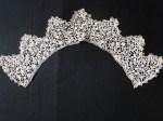 Comments: A collar of late 17th c Point de Neige or Punto Neve. This piece has the vermicular base typical of Italian work, along with elaborate decoration of the raised edges. It is not in original form, but has been cut down to a 19th century collar pattern. And the decoration isn’t quite consistent from one end of the piece to the other, so it’s probably been pieced together. Still, the work is beautiful and it is a lovely sample piece. A few loose brides – it’s always amazing how this kind of lace survives as well as it does.