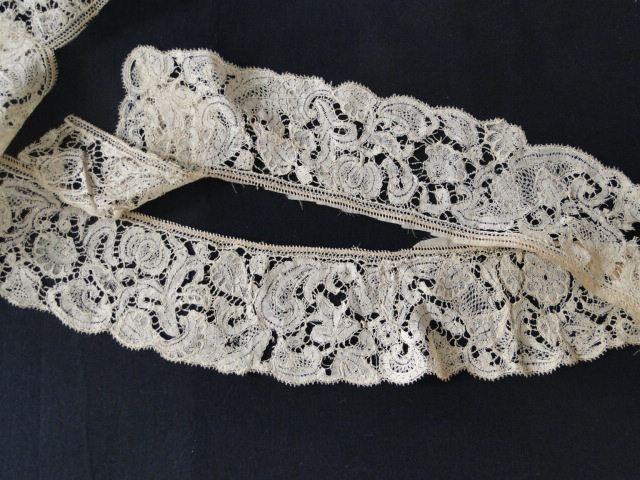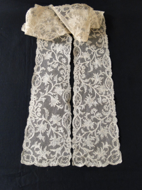 Comments: An early 18th c Brussels bobbinlace with brides. I think the picot edge has been added later, not enough closeups to really tell. The design is a bit confused, and the piece is rather the worse for wear, but it’s a nice example of the type.