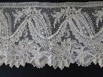 Comments: Not sure exactly what is going on here, this seller sold a piece of the same description, size, and photos #190745762704 on November 5th. So I’ll repeat the description: A Brussels bobbinlace application on machine net, with a few discrete needlelace fillings. It is very wide, and I’d label it a Crinoline Flounce if the design were better. I tend to reserve that term for wide appliques of outstanding design, but perhaps I’m nitpicking. The motifs are a bit large and a little loosely worked, and the esprits aren’t too densely scattered – more in keeping with the design. But it’s a good upper middle market product. And it gets lots of points for very good condition.